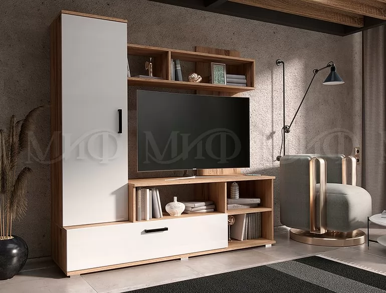 Миниатюрная стенка "Мини" в неповторимом стиле, с местом под большой телевизор. Она вместит в себя все самое необходимое. Современное удобное решение для маленькой гостиной или спальной комнаты.