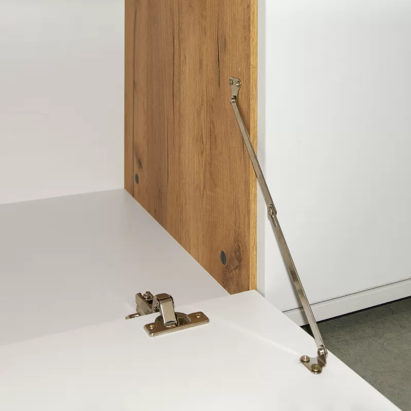 Тумба ТВ "Бэль" №10.91 разделена на три отделения. В левом за распашной дверкой находится полка, центральное также разделено на две ниши. Правое занимает выдвижной ящик и секция с откидной дверкой.