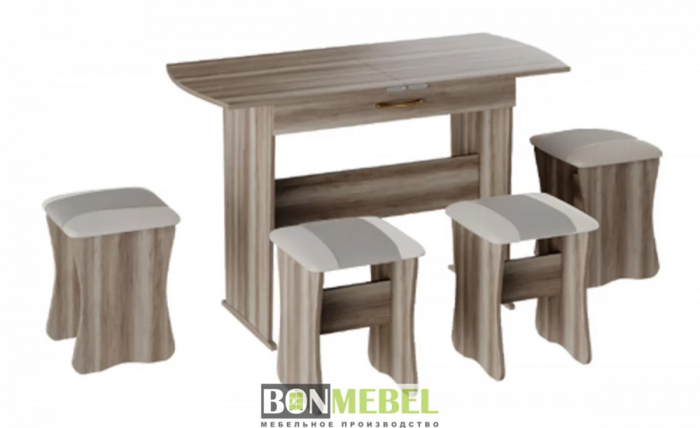Обеденная группа с табуретами Тип-2 станет практичной и уютной обеденной зоной для вас и ваших гостей. Комплект рассчитан на четыре персоны. Встроенный механизм трансформации позволит увеличить ширину стола почти с 750 мм до 1200 мм. Обивка из экокожи устойчива к различным загрязнениям и не требует обработки специальными средствами. Мягкие сиденья табуретов имеют мягкое и упругое наполнение, что повышает уровень комфортабельности. Различные варианты расцветки помогут подобрать идеальный комплект. Для изготовления изделий используется прочная ЛДСП. Обивка табуретов выполнена из искусственной кожи.