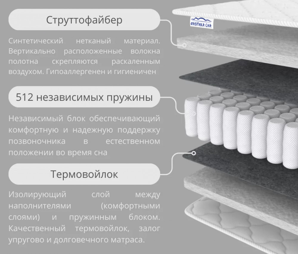 Состав: Струттофайбер - 3 см/Термовойлок/Блок независимых пружин/Термовойлок/ Струттофайбер - 3 см