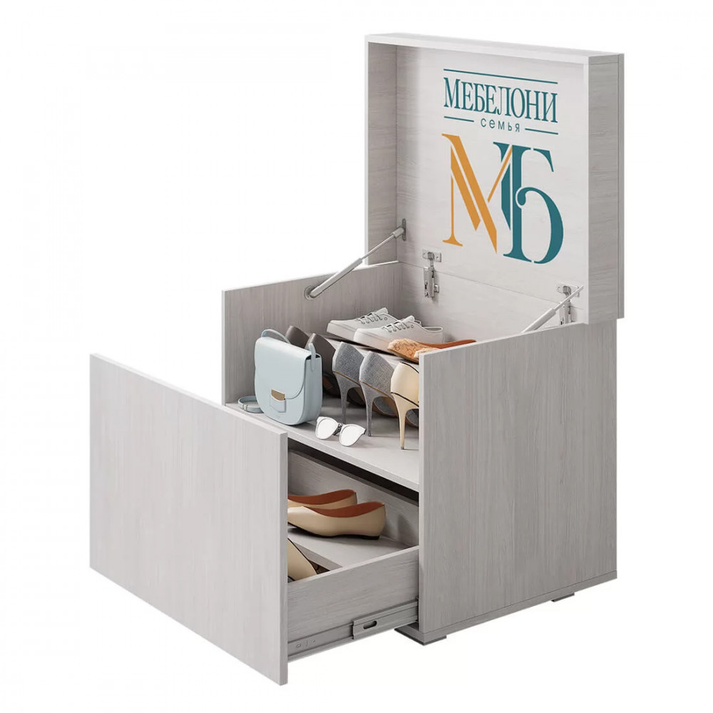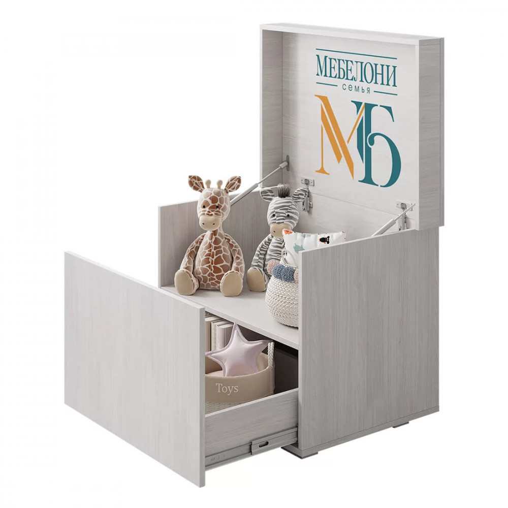 Например, в прихожей она может стать удобной обувницей, а в детской – идеальным местом хранения игрушек. Любая девушка будет рада такой изящной и вместительной «косметичке». Фасад и корпус тумбы выполнены в цвете ясень белый, благодаря чему модель выглядит лёгкой и компактной. Крышка тумбы, на которую фотопечатью нанесён фирменный паттерн, плавно открывается при помощи механизма газлифт. Фасад нижнего выдвижного ящика на шариковых направляющих, полностью закрывает верхнюю полку. Особенностью тумбы являются дополнительные регулируемые полки в верхней и нижней нишах.
