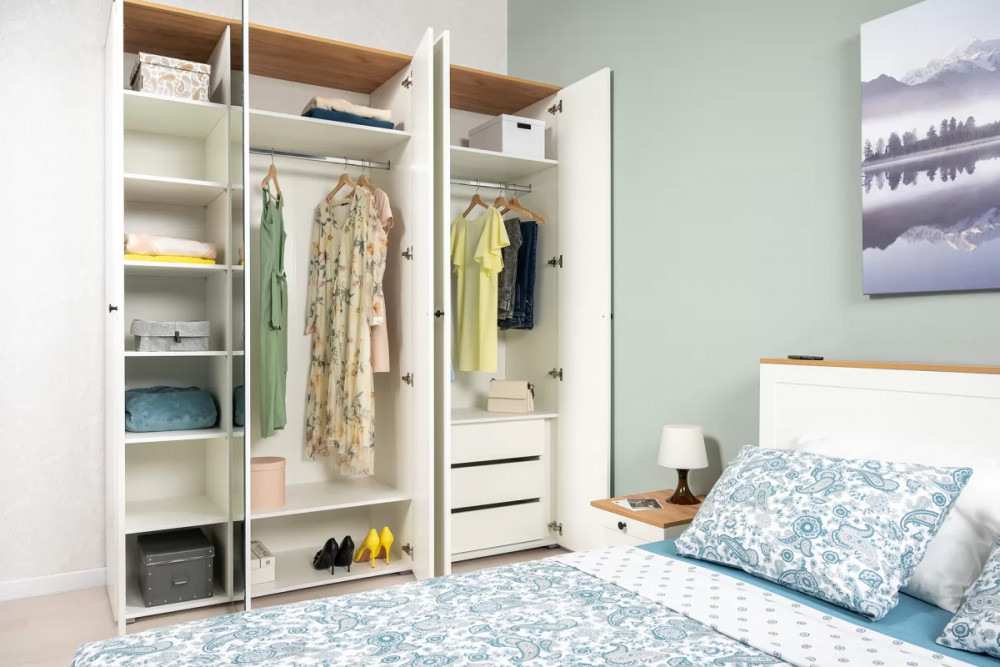 В изголовье кровати предусмотрены вместительные ниши. Шкафная группа полноценной глубины позволяет эффективно организовать систему хранения.