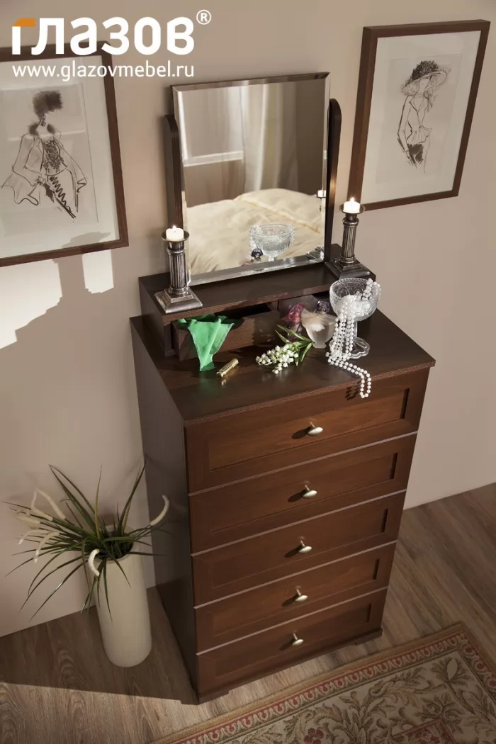 6 (гостиная) Комод — яркая деталь классического интерьера. В небольшой спальне он может выполнять не только свою основную роль, но и в сочетании с модулем 55 Трюмо с ящиками стать альтернативой туалетного столика. Поворотное зеркало позволит нанести макияж, а ящички – сэкономить место и разложить аксессуары как в шкатулке.